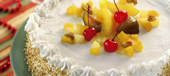 Unte a forma desmontável pequena com manteiga e farinha de trigo. Despeje a massa, e corte as frutas em conserva em pedaços menores e as coloque por cima. Leve ao forno pré-aquecido à 180ºC por cerca de 40 ou 50 minutos.
