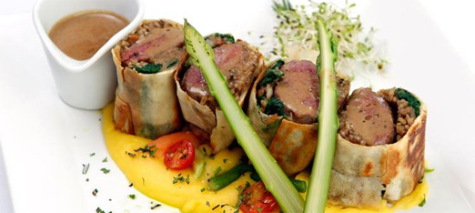 Feche, com a ajuda de um palito, grelhe até atingir o ponto de serviço. Reserve, mantendo aquecido.