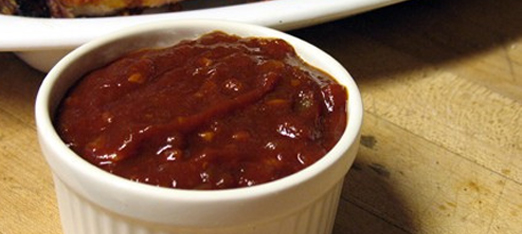 Enquanto os tomates estão a defumar, corte a cebola em fatias finas, coloque-a numa sertã com alho e gengibre. Deixe refogar um pouco e junte o melaço, o açúcar mascavado, o vinagre e o molho de soja. Deixe cozinhar uns minutos e junte os tomates fumados. Deixe cozinhar até reduzir o seu volume 1/3. Para finalizar triture tudo para conseguir uma textura homogênea.