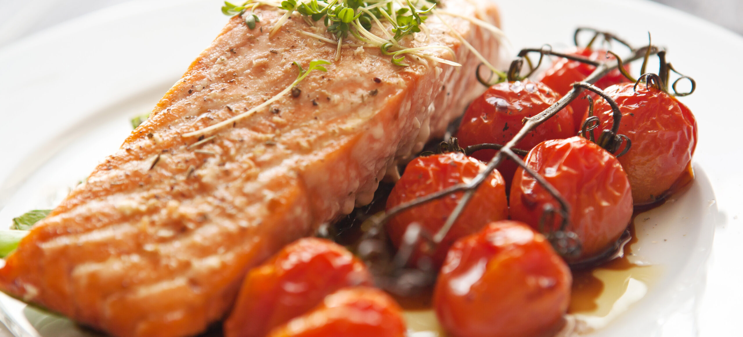 Sirva com os legumes na base, por cima a posta de salmão e a seguir os tomates assados. Tempere com um fio de azeite e ervas frescas.